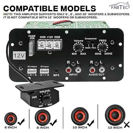 - Note: This amplifier supports only 6”, 8”, and 10” woofers & subwoofers. It is not compatible with 12” woofers or subwoofers.