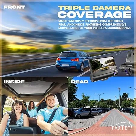 FABTEC 3 Channel DVR Dash Camera Full HD 1080P with Front, Rear and Cabin View Recording Camera for Car Security