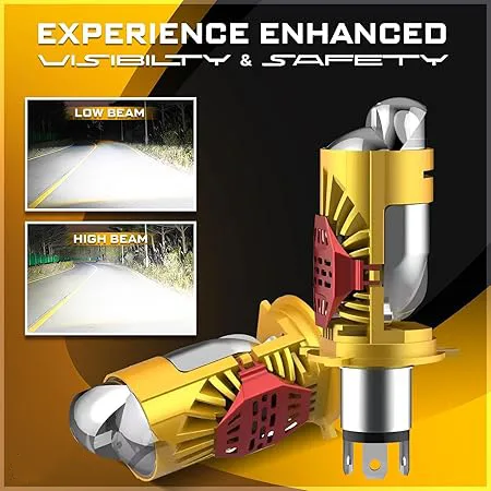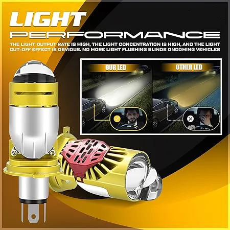 • H4 led headlight bulbs with projector lens. Low beam: The irradiation angle is wider, and you can find the clear cut-off line.Will not blind coming drivers.High beam: The light is concentrated and longer range. You can see the road over 500ft. Solved the problem that the beam change of ordinary H4 LED bulbs is not obvious when switching between high beam and low beam.