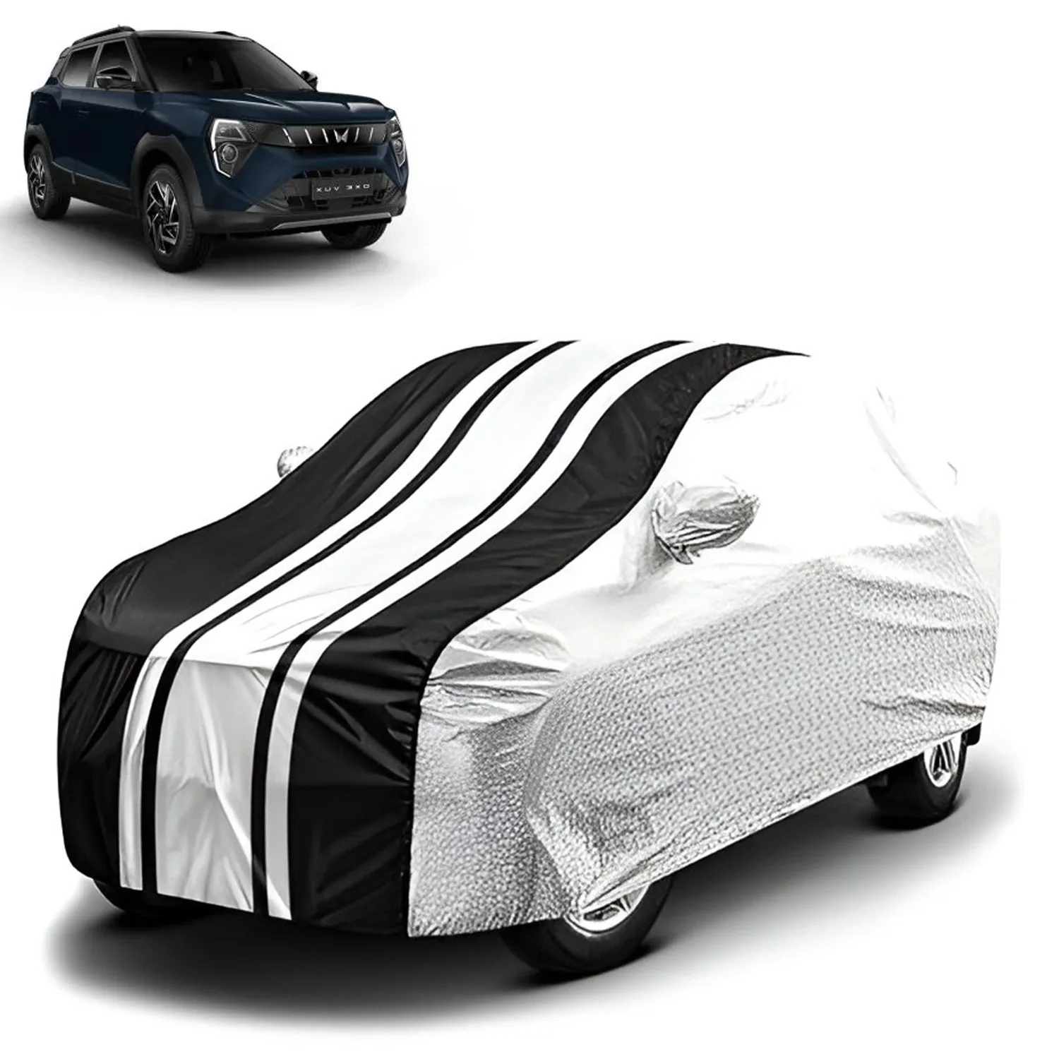 FABTEC – Metallic Silver & Black Stripes Waterproof Car Body Cover for Maruti Suzuki Brezza