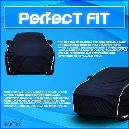 Fabtec Waterproof Car Body Cover for Tata Punch with Mirror Pocket, Triple Stitched and Soft Cotton Lining (Metallic Blue with White Piping)