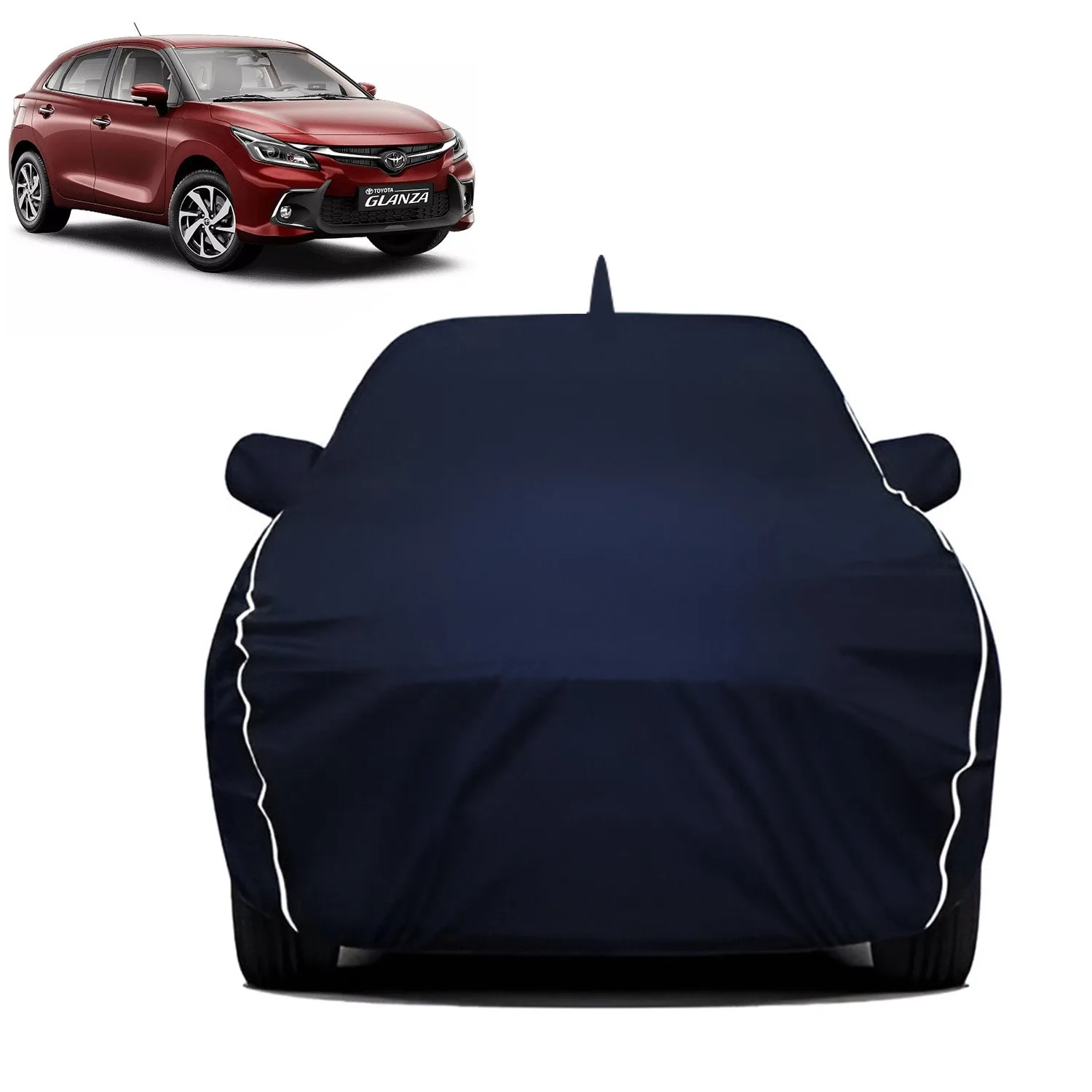 Fabtec Waterproof Car Body Cover for Toyota Glanza Old with Mirror And Antenna Pocket, Triple Stitched and Soft Cotton Lining (Metallic Blue with White Piping)